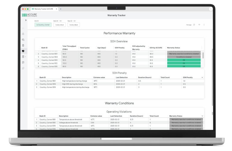 ACCURE’s Guarantee Tracker solves this downside by constantly monitoring the BESS utilizing predictive analytics know-how. The platform analyzes battery knowledge, identifies any operational points, comparable to temperatures or voltage ranges which may result in exceeding the guarantee limits, and alerts the BESS operator. As soon as notified, the operator can decide the reason for the difficulty, treatment the scenario and keep away from violating the guarantee.