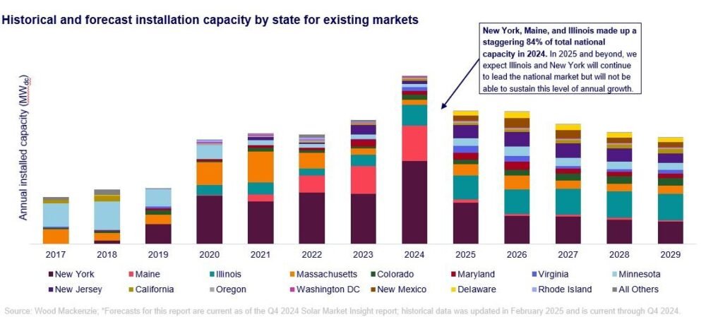 “We noticed spectacular exercise in 2024, leading to our strongest 12 months but for group photo voltaic development,” stated Caitlin Connelly, analysis analyst and lead writer of the report. “Nonetheless, regardless of spectacular 2024 set up volumes, the highest state markets are saturating shortly and won’t be able to maintain the identical ranges of development long-term. Moreover, rising markets have been sluggish to ramp up and program dimension caps restrict the potential for development in these states to make up for declines in bigger markets.”