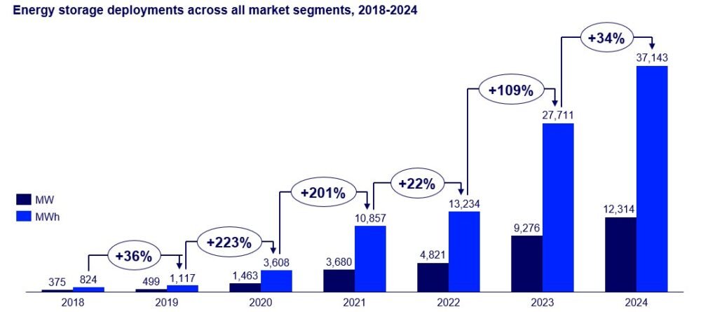 The U.S. power storage market set a brand new report in 2024 with 12.3 GW of installations throughout all segments, based on the newest “U.S. Energy Storage Monitor” report launched by the American Clear Energy Affiliation (ACP) and Wooden Mackenzie. The report reveals a complete of 12,314 MW and 37,143 MWh deployed, representing will increase of 33% and 34% respectively over 2023 numbers.